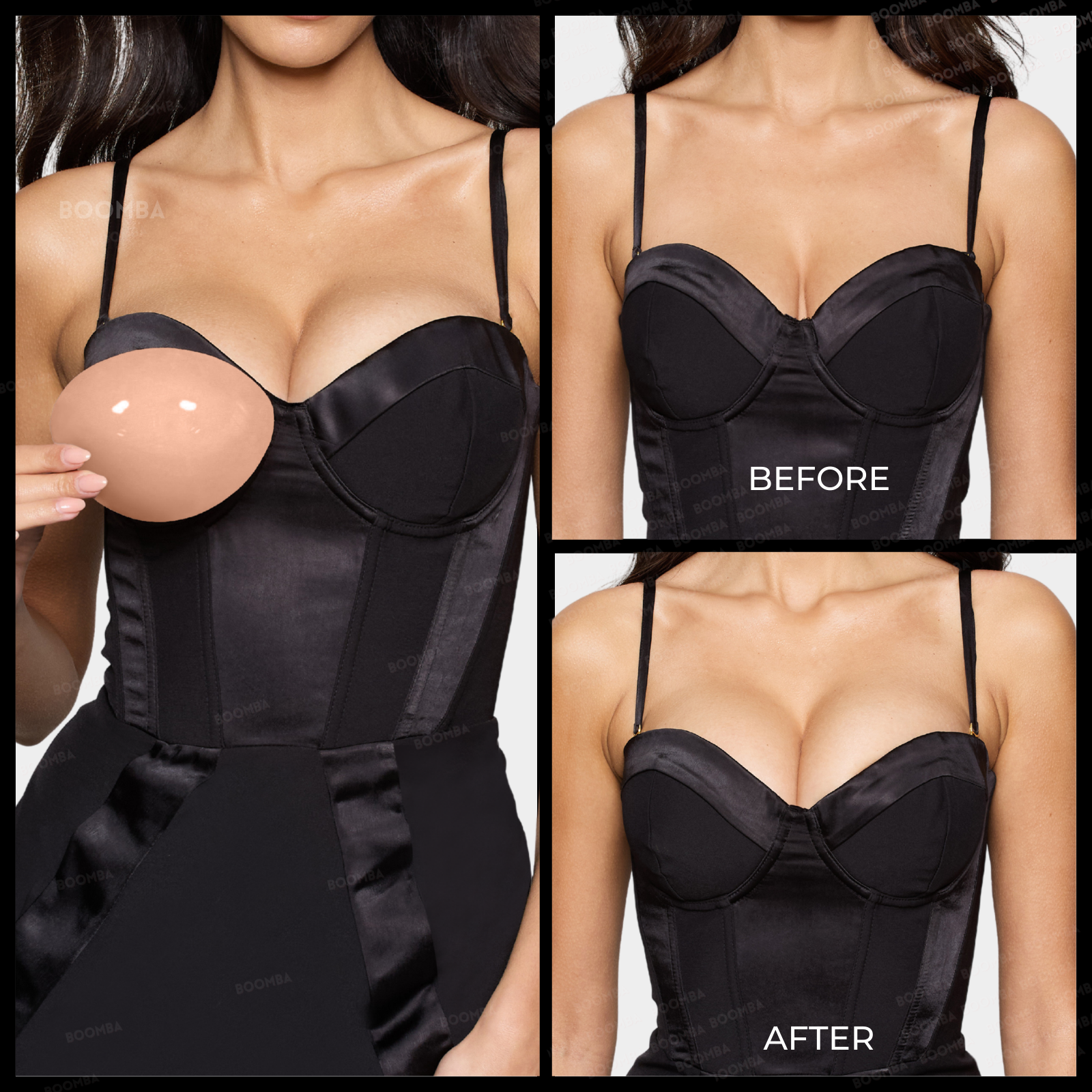 Check out BOOMBA’s Size Guide to find out which size is suitable for your body. Please note that results may vary depending on breast size and shape. Results will be similar to a double push up bra. BOOMBA results work best with natural breasts.