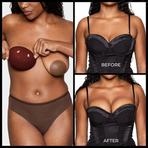 Preparation is key! Before using BOOMBA inserts, please ensure breasts are clean and dry. Any makeup, oil, lotion or other body products may hinder the inserts from sticking onto your skin properly. Put the clothing item on your body first, then place inserts onto the clothing item, then scoop breasts and stick onto the insert to secure.