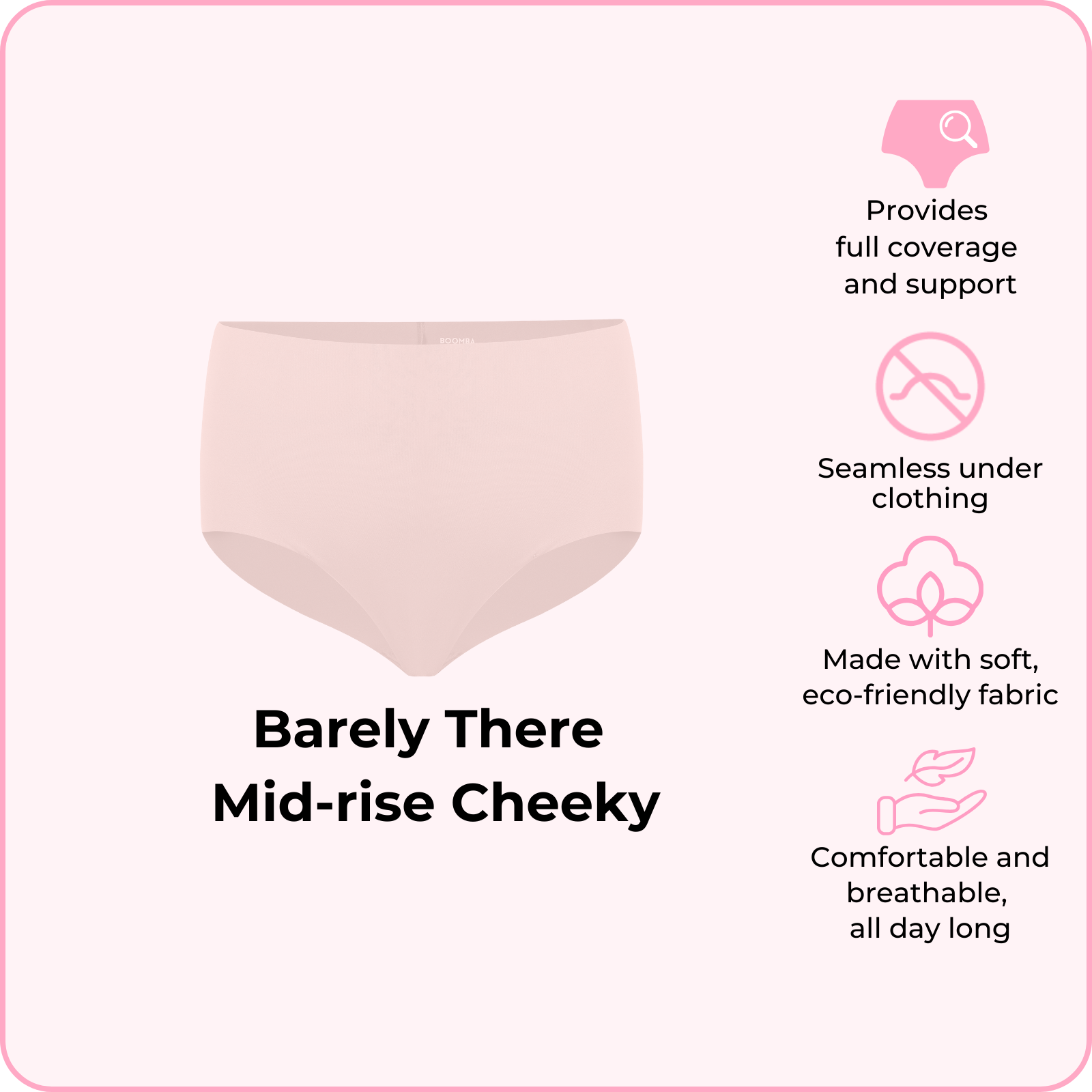 The BOOMBA Barely There Mid-Rise Cheeky is like a hug for your hips—comfy, cute, and totally invisible! With ultra-soft, seamless fabric, it feels like you’re wearing nothing (but in the best way). The mid-rise cut and cheeky back give you a flattering shape, making it your new go-to for everything from Netflix binges to date nights. Slip into this cheeky little number and feel fab all day long!