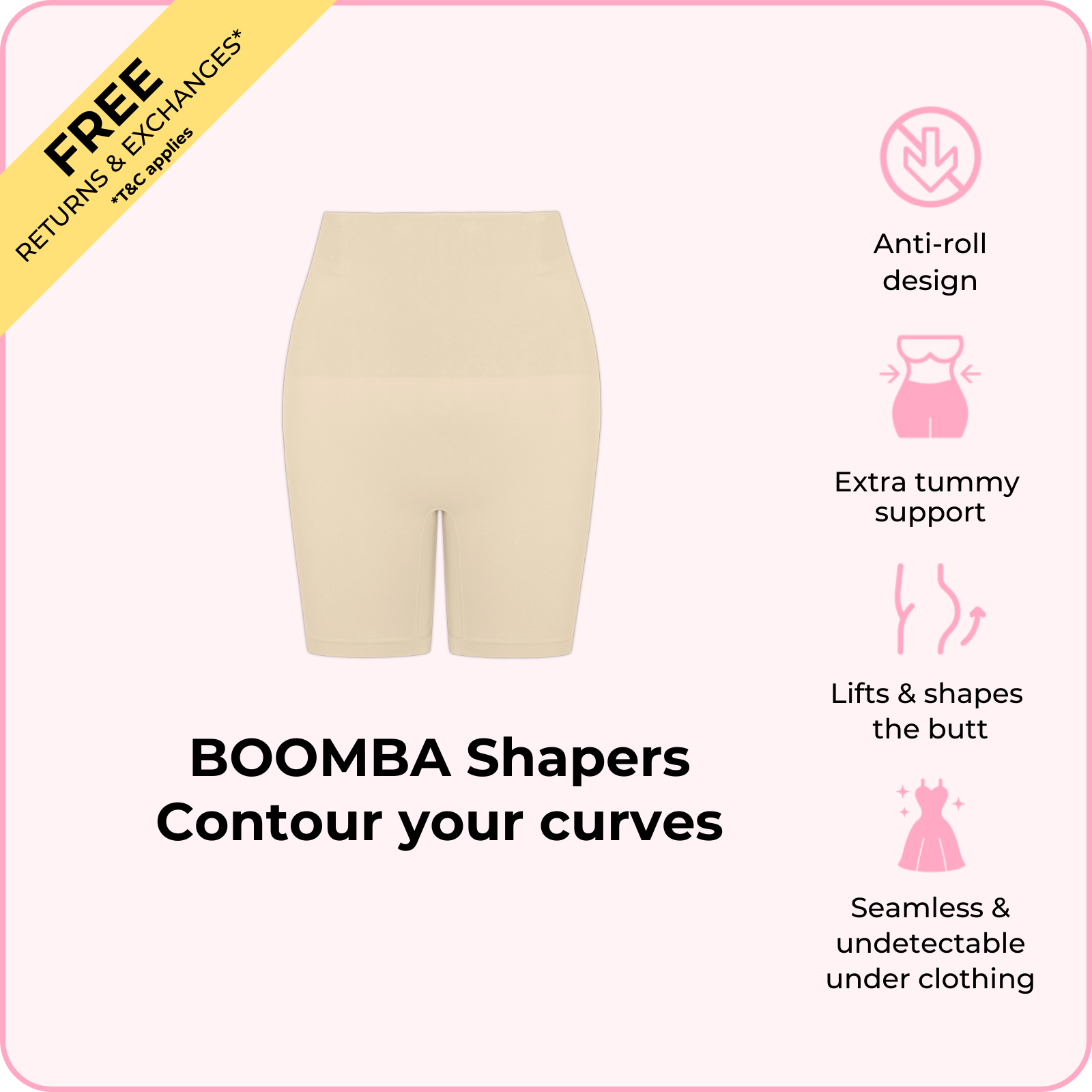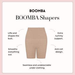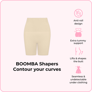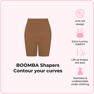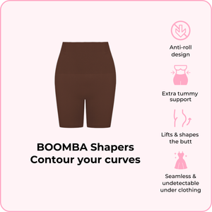 BOOMBA’s Shapers hug you in all the right places—designed to contour, lift, and shape your body seamlessly from brunch to bedtime. Our unique anti-roll design means no constant tugging or slipping, just all-day comfort under your favorite outfits for a smooth silhouette.