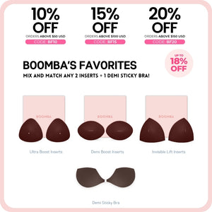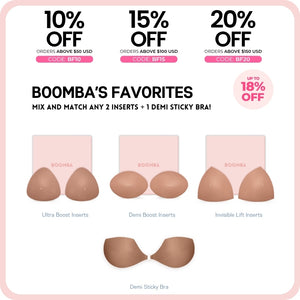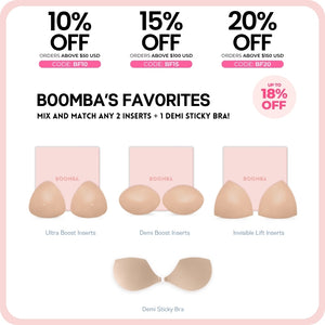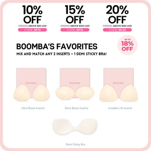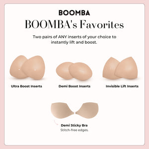 This bundle contains 2 of our best-selling inserts of your choice and the BOOMBA Demi Sticky Bra. Hand-picked as our personal faves, this bundle includes all the essentials you need to look great and feel great on any occasion.