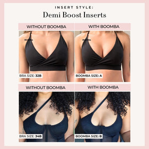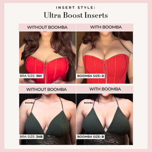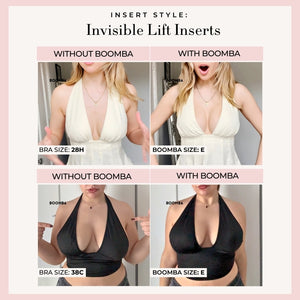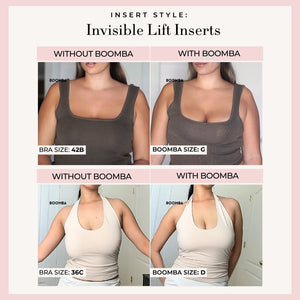 Please note that results may vary depending on breast size and shape. Results will be similar to a double push up bra. BOOMBA’s padded inserts work best with natural breasts.