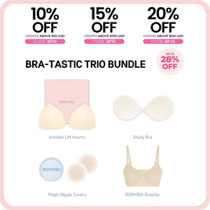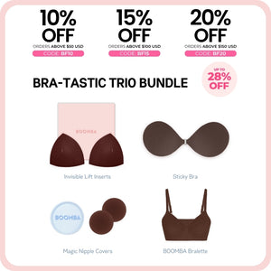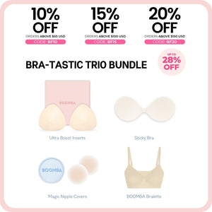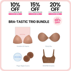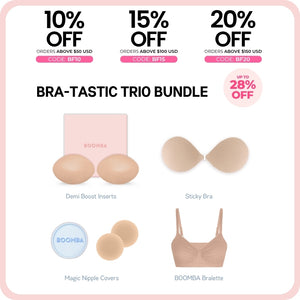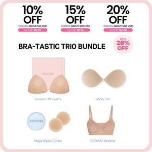 How to Remove: To remove your sticky bra, unclasp and gently peel off one cup at a time, starting from the top outer edge. Reapply protective films onto the sticky bra and store back into the BOOMBA gift box, away from direct sunlight.