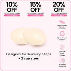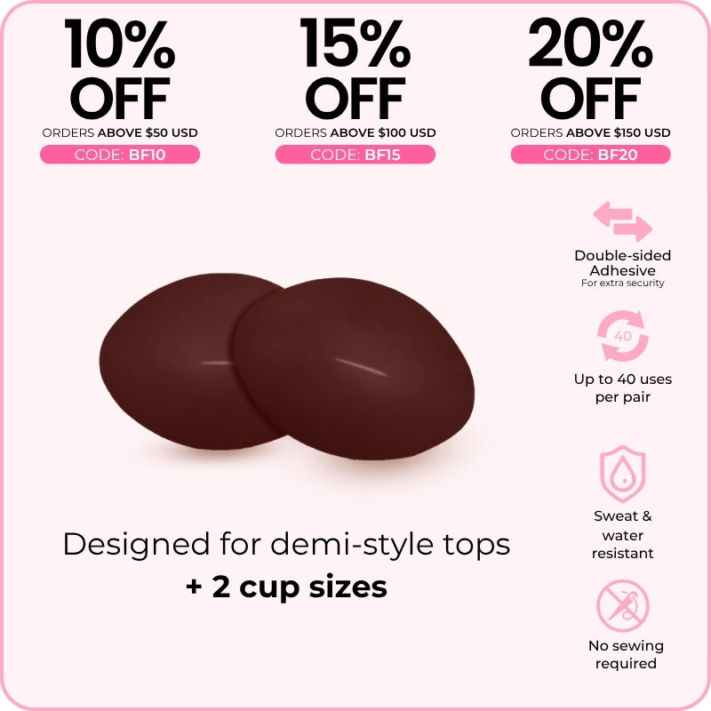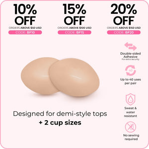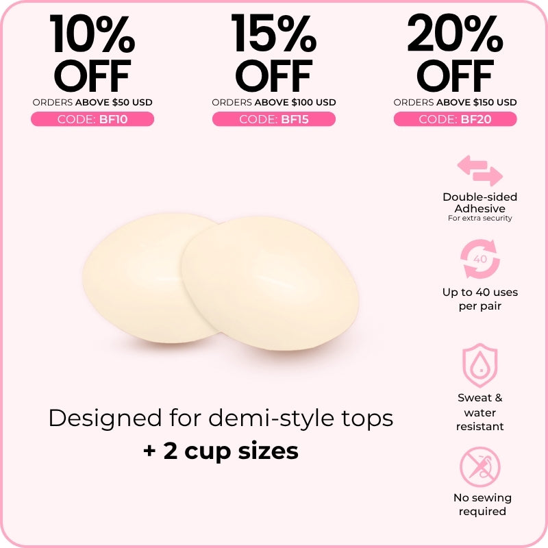 Preparation is key! Before using BOOMBA inserts, please ensure breasts are clean and dry. Any makeup, oil, lotion or other body products may hinder the inserts from sticking onto your skin properly. Put the clothing item on your body first, then place inserts onto the clothing item, then scoop breasts and stick onto the insert to secure.