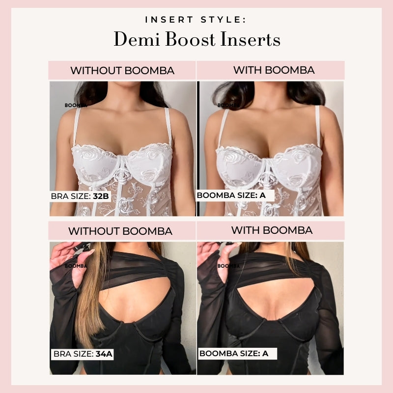 Please note that results may vary depending on breast size and shape. Results will be similar to a double push up bra. BOOMBA padded inserts work best with natural breasts.