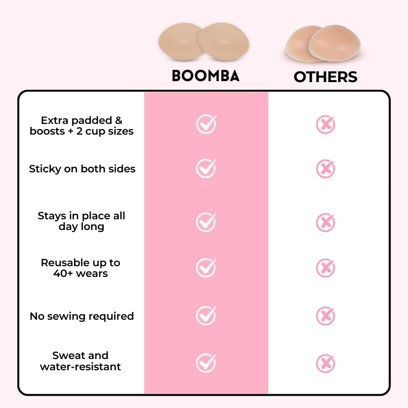 Check out BOOMBA’s Size Guide to find out which size is suitable for your body. Please note that results may vary depending on breast size and shape. Results will be similar to a double push up bra. BOOMBA results work best with natural breasts.