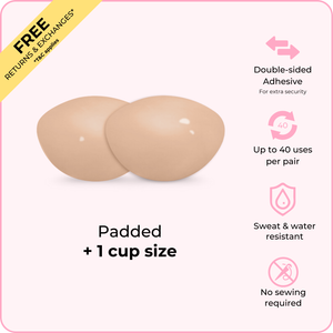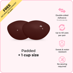 Preparation is key! Before using BOOMBA inserts, please ensure breasts are clean and dry. Any makeup, oil, lotion or other body products may hinder the inserts from sticking onto your skin properly. Put the clothing item on your body first, then place inserts onto the clothing item, then scoop breasts and stick onto the insert to secure.