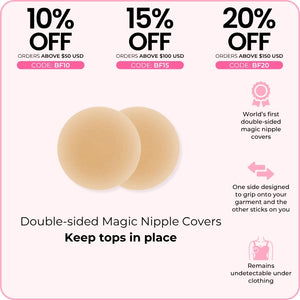 World’s first double-sided magic nipple covers, one side designed to grip onto your garment and the other sticks on you. Keeps clothing in place while remaining undetectable under your clothing.