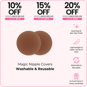 Magic Nipple Covers (non-adhesive) adhere using our advanced suction technology, they are able to adhere to your skin, without any adhesive.
