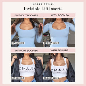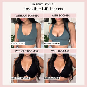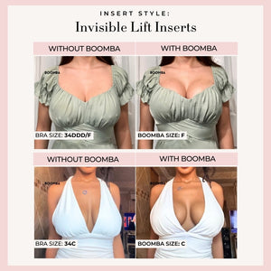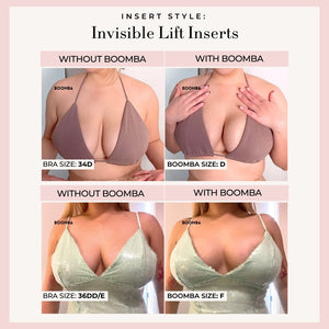 Please note that results may vary depending on breast size and shape. Results will be similar to a double push up bra. BOOMBA padded inserts work best with natural breasts.
