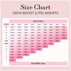 For sizes 34I and up, our Demi Boost Inserts (double push-up) are available in sizes up to 34M and our Invisible Lift Inserts (lightly padded) are available in sizes up to 34R.