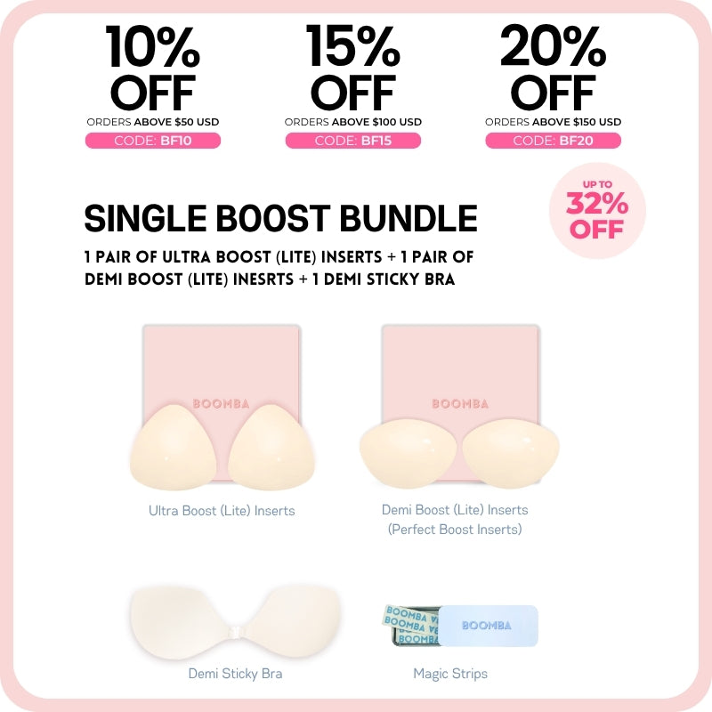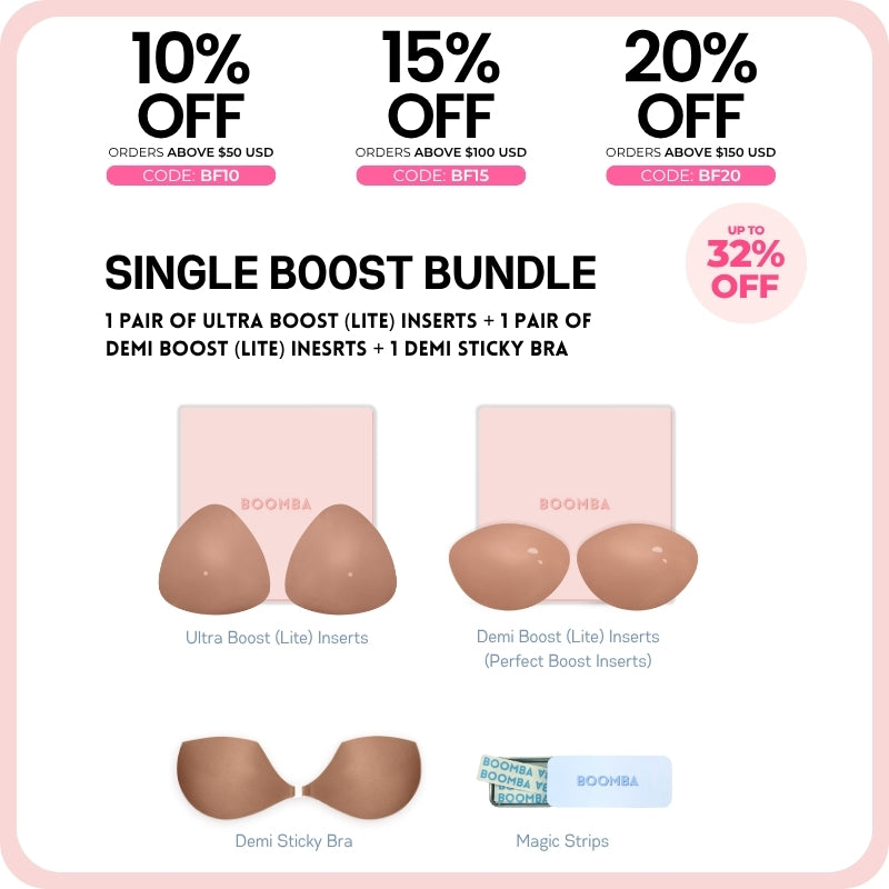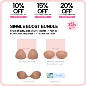 Looking for a natural-looking boost? Our Single Boost Bundle is made for you! Featuring the thinner versions of our best-selling Ultra Boost (Lite) and Demi Boost (Lite) Inserts. These Lite versions still deliver a noticeable lift and boost, just without the extra padding. Instantly add up to one cup size for a natural, everyday enhancement. Perfect for when you want a boost that’s low key but still high impact.