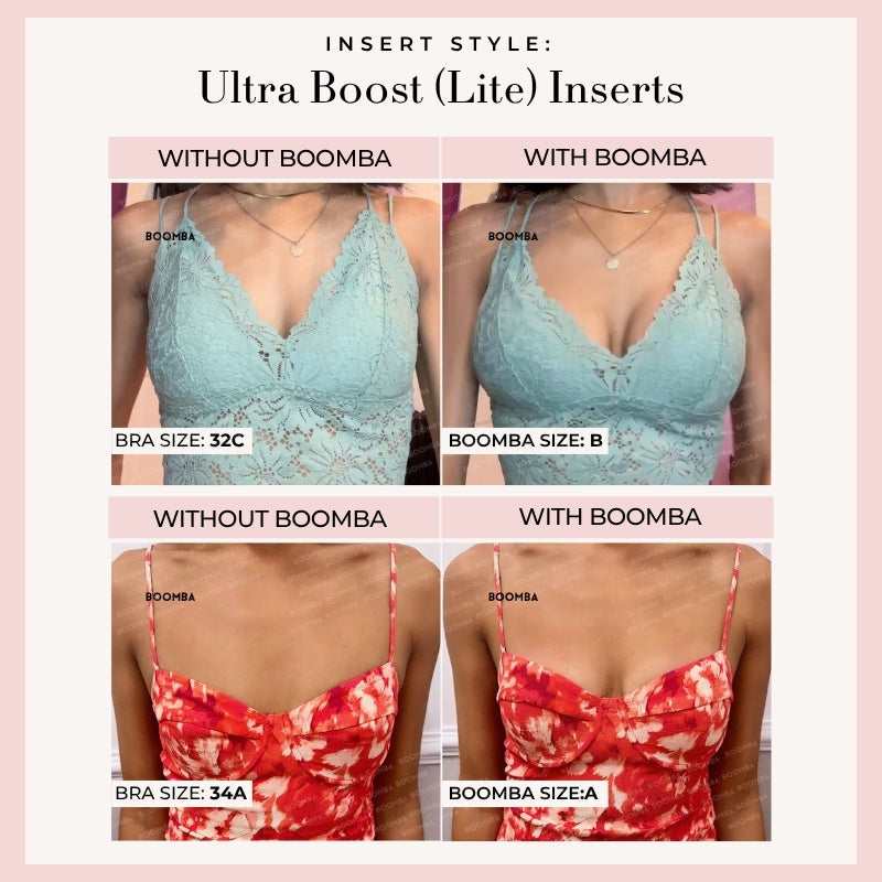 Please note that results may vary depending on breast size and shape. Results will be similar to a push up bra. BOOMBA padded inserts work best with natural breasts.