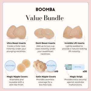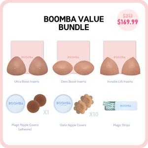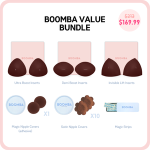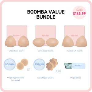 This bundle contains all three styles of our popular inserts, Ultra Boost, Demi Boost, and Invisible Lift. It also contains our best-selling Magic Nipple Covers (adhesive), Satin Nipple Covers, and BOOMBA Magic Strips.