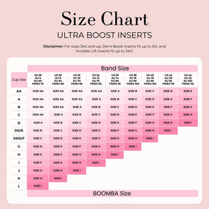 For sizes 34I and up, our Demi Boost Inserts (double push-up) are available in sizes up to 34M and our Invisible Lift Inserts (lightly padded) are available in sizes up to 34R.