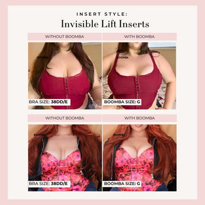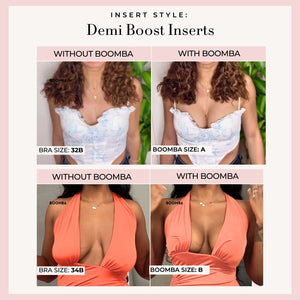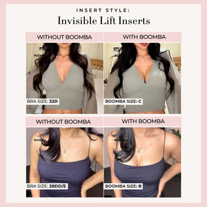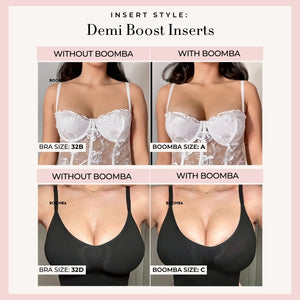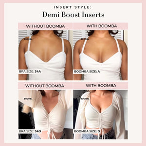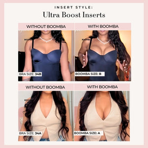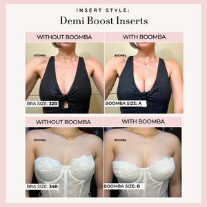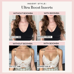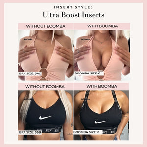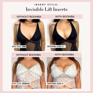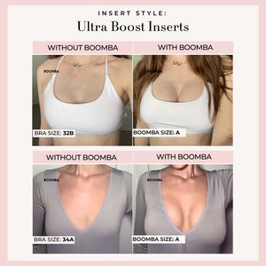 Please note that results may vary depending on breast size and shape. Results will be similar to a double push up bra. BOOMBA’s padded inserts work best with natural breasts.