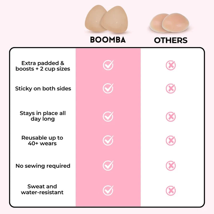 Check out BOOMBA’s Size Guide to find out which size is suitable for your body. Please note that results may vary depending on breast size and shape. Results will be similar to a double push up bra. BOOMBA results work best with natural breasts.