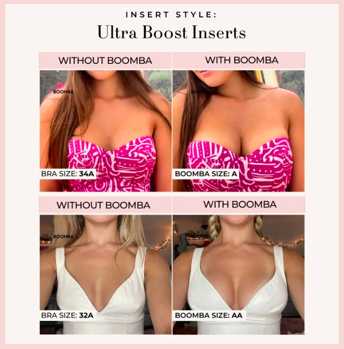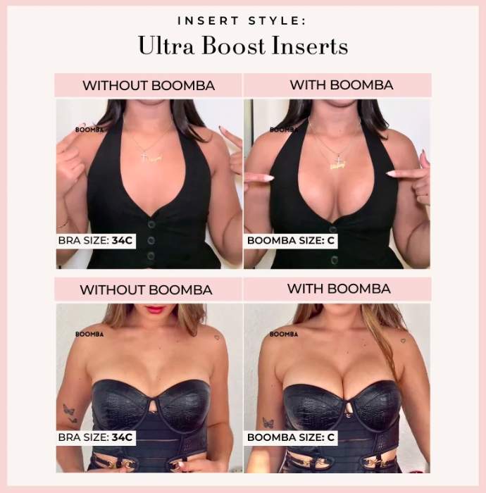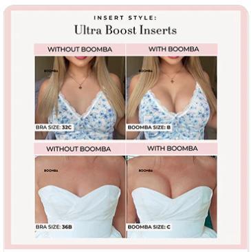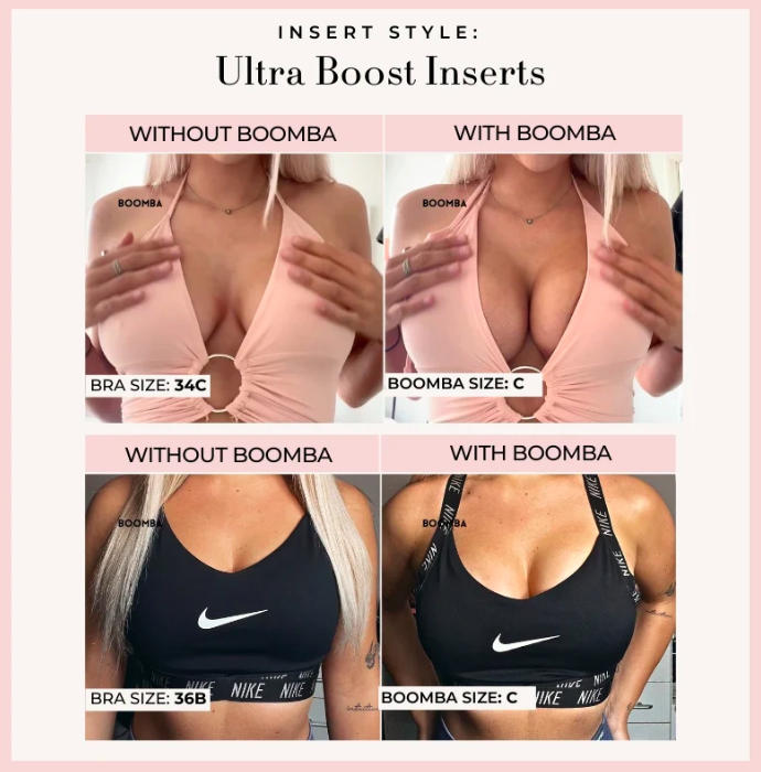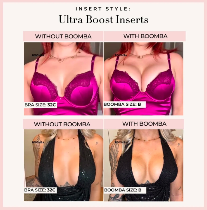 Please note that results may vary depending on breast size and shape. Results will be similar to a double push up bra. BOOMBA’s padded inserts work best with natural breasts.